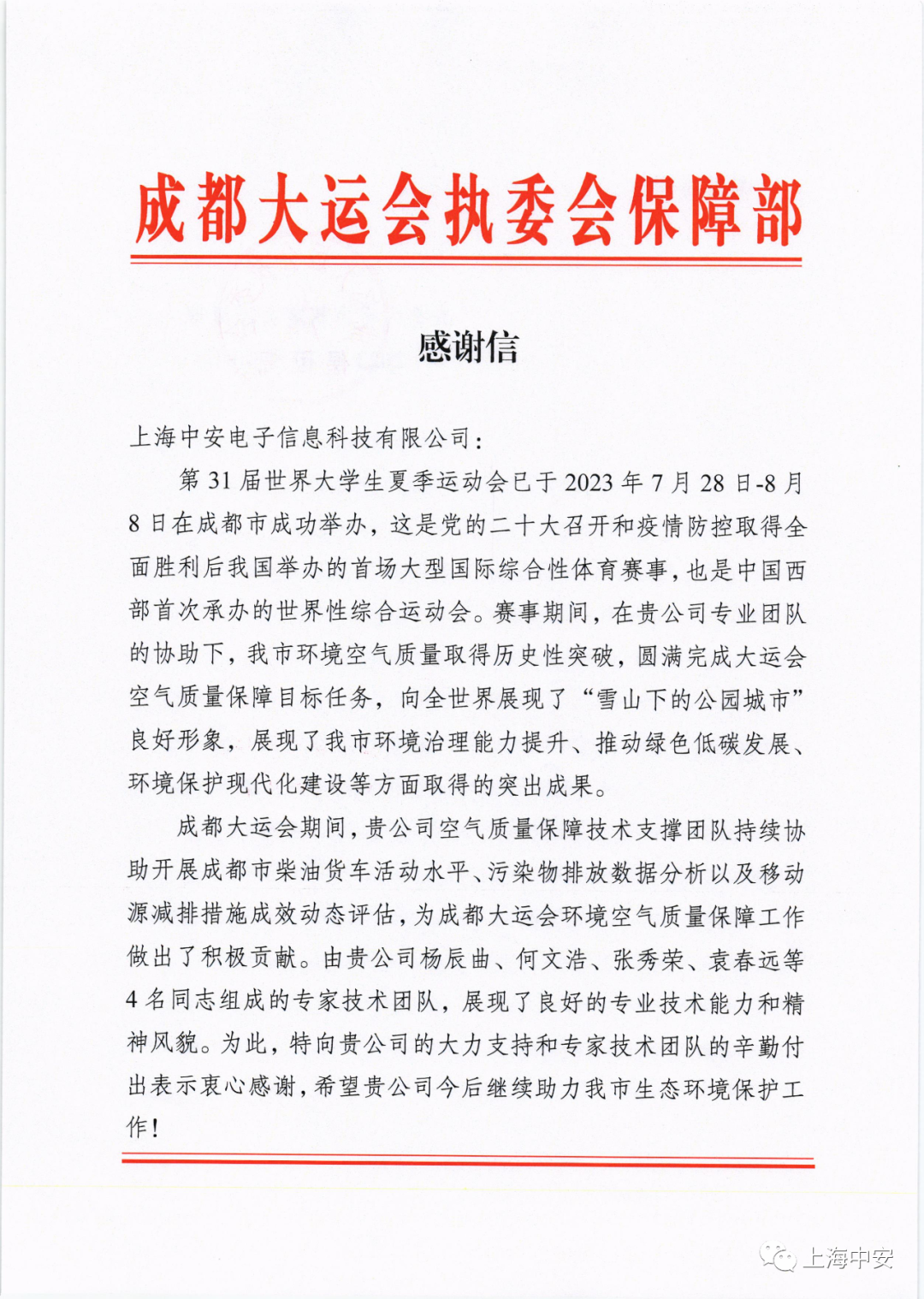 成都大運(yùn)會執(zhí)委會保障部發(fā)來一封感謝信!(2023-10-15)