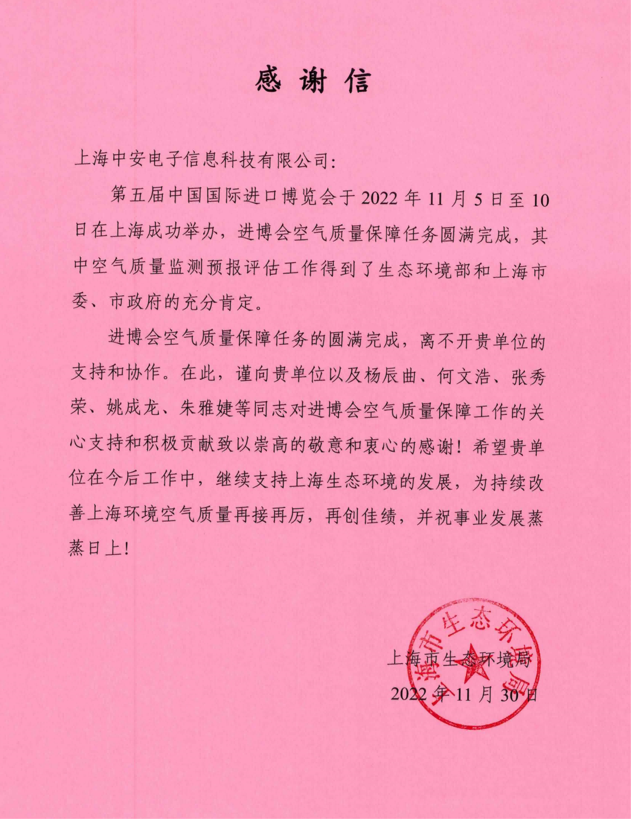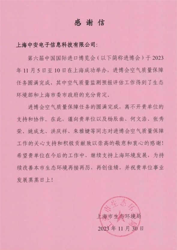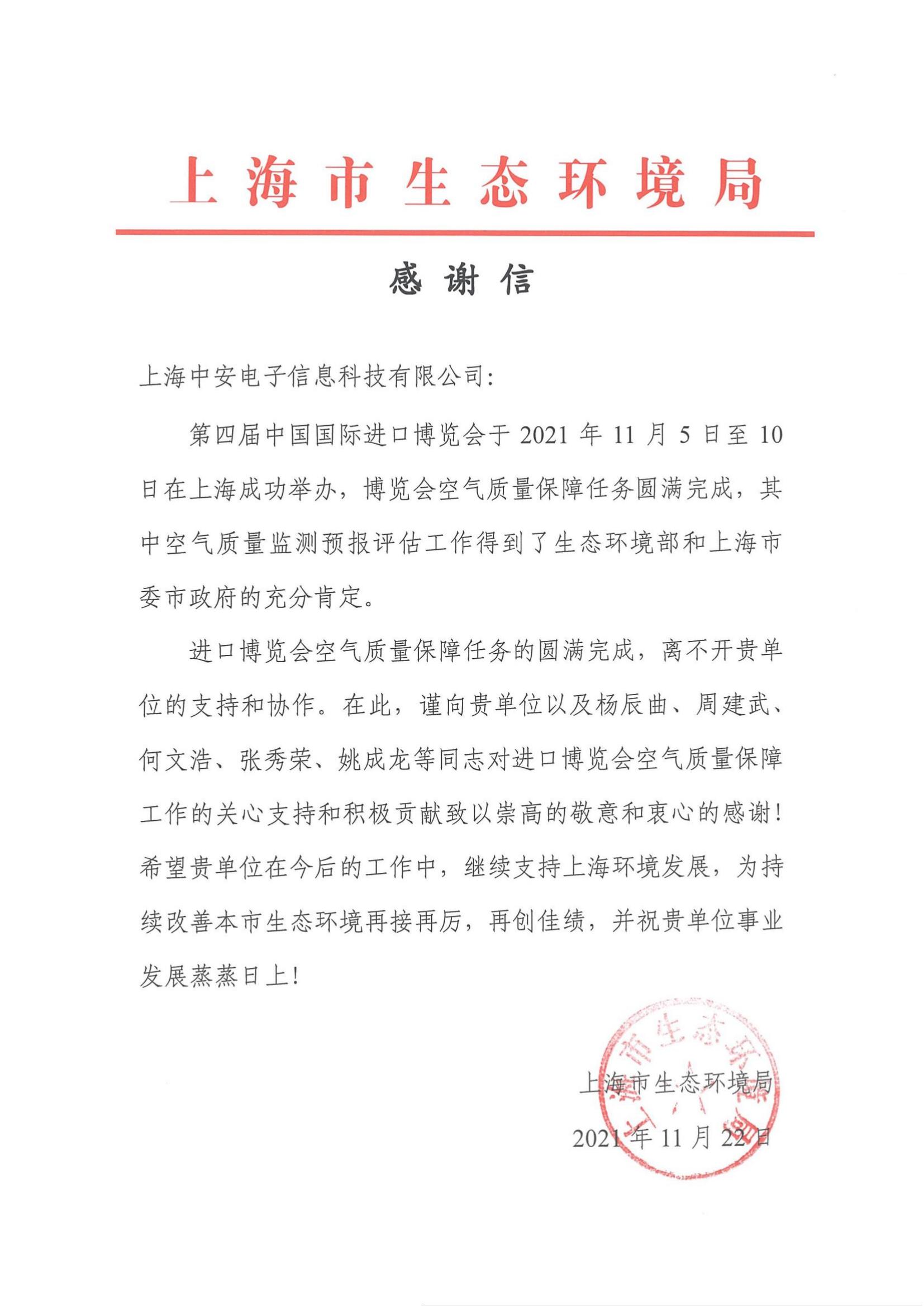 上海環(huán)監(jiān)中心就中安科技在21年國際進(jìn)博會空氣質(zhì)量監(jiān)測預(yù)報(bào)工作中杰出貢獻(xiàn)送來感謝信!(2021/12/31)